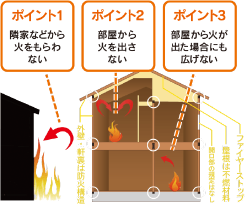 3つの考えに基づいた対策が施され、万が一の火災時にも避難時間を十分に確保できる性能を持っていると公的に認められた構造のことです。
